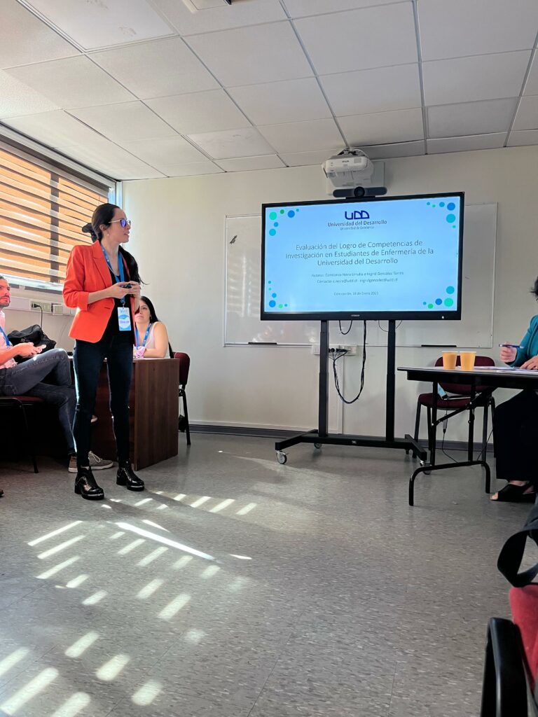 Por su parte, Constanza Neira expuso el trabajo “Evaluación del Logro de Competencias de Investigación en la Carrera de Enfermería, Universidad del Desarrollo”, el cual aborda la incorporación de la investigación como una competencia transversal en la formación de futuros profesionales, fomentando el pensamiento crítico y la práctica basada en evidencia.
